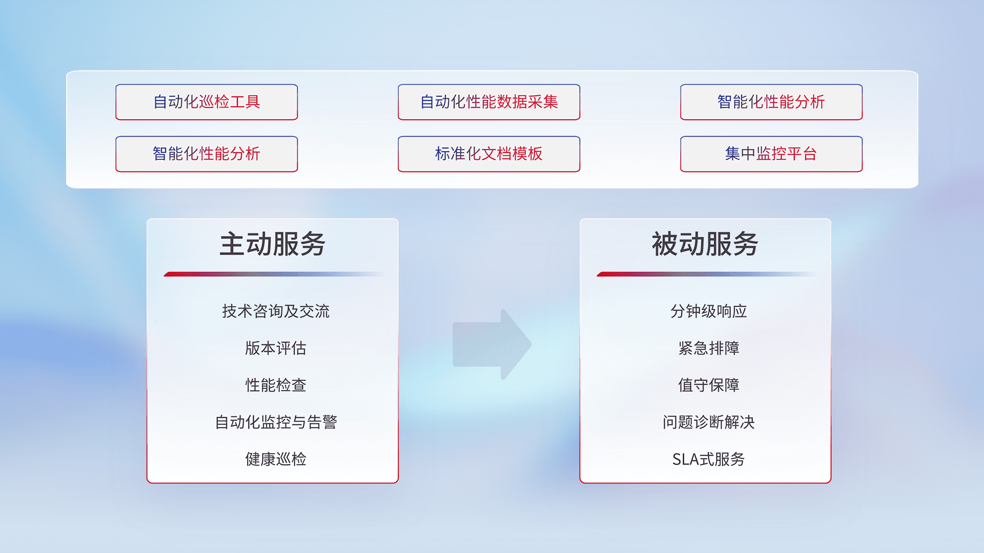 智能化工具和标准化文档,,,保障服务质量,,,,提供主动服务(包含技术咨询、、、版本评估、、性能检查、、、自动化监控与告警、、、、健康巡检)和被动服务包含(分钟级响应、、、、紧急排障、、、、值守保障、、、、问题诊断解决、、SLA服务)。。。。